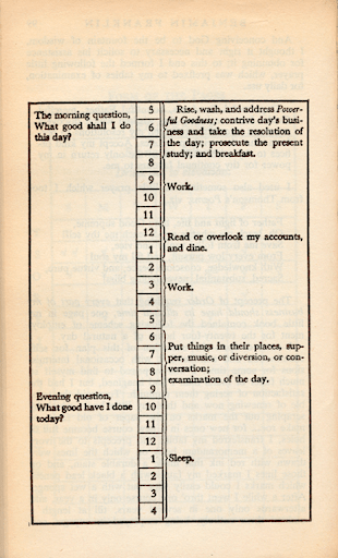 “That which you do everyday becomes who you are” is a profound quote, when googled, has murky origins. Some attribute the quote as a version of Aristotle, “Virtues are formed in man by his doing the actions”. Ben Franklin had a daily agenda that he used in the formation of daily habits in formation of character. (see below)
